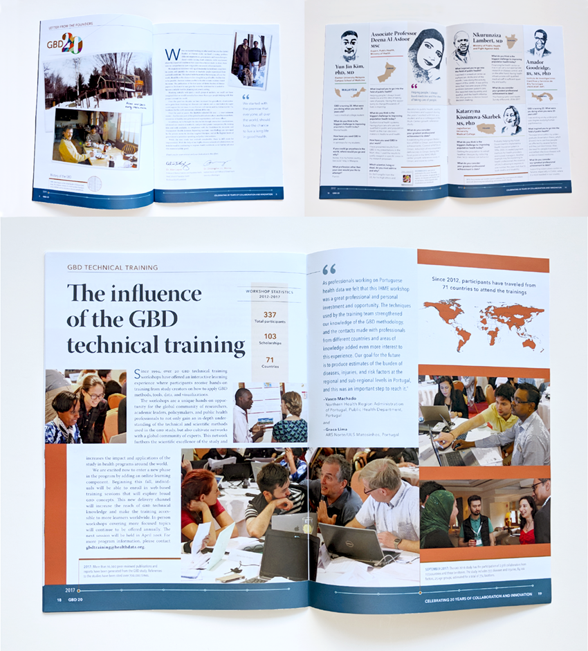 The Global Burden of Disease (GBD) Study celebrated 20 years in 2017. I got to create the logo and the layout for a special magazine to be presented at the event. The Key Note speakers were Bill Gates and Jim Kim. This was kind of a memoir about the GBD and also honored the many GBD collaborators from all over the world.