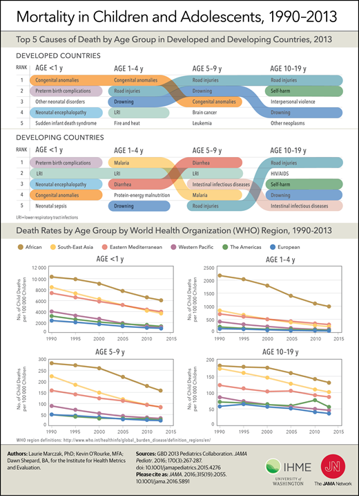 IHME and JAMA collaborated to produce six infographics. I was the designer and cited as an author. The topics vary from gun violence to child mortality. Here are the links to all of them.
